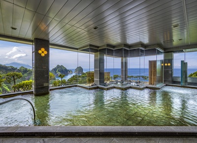 大浴場は開放的なガラス越しに堂ヶ島の絶景が一面に広がり、普段体験できない絶景風呂でのご入浴をお楽しみください。
